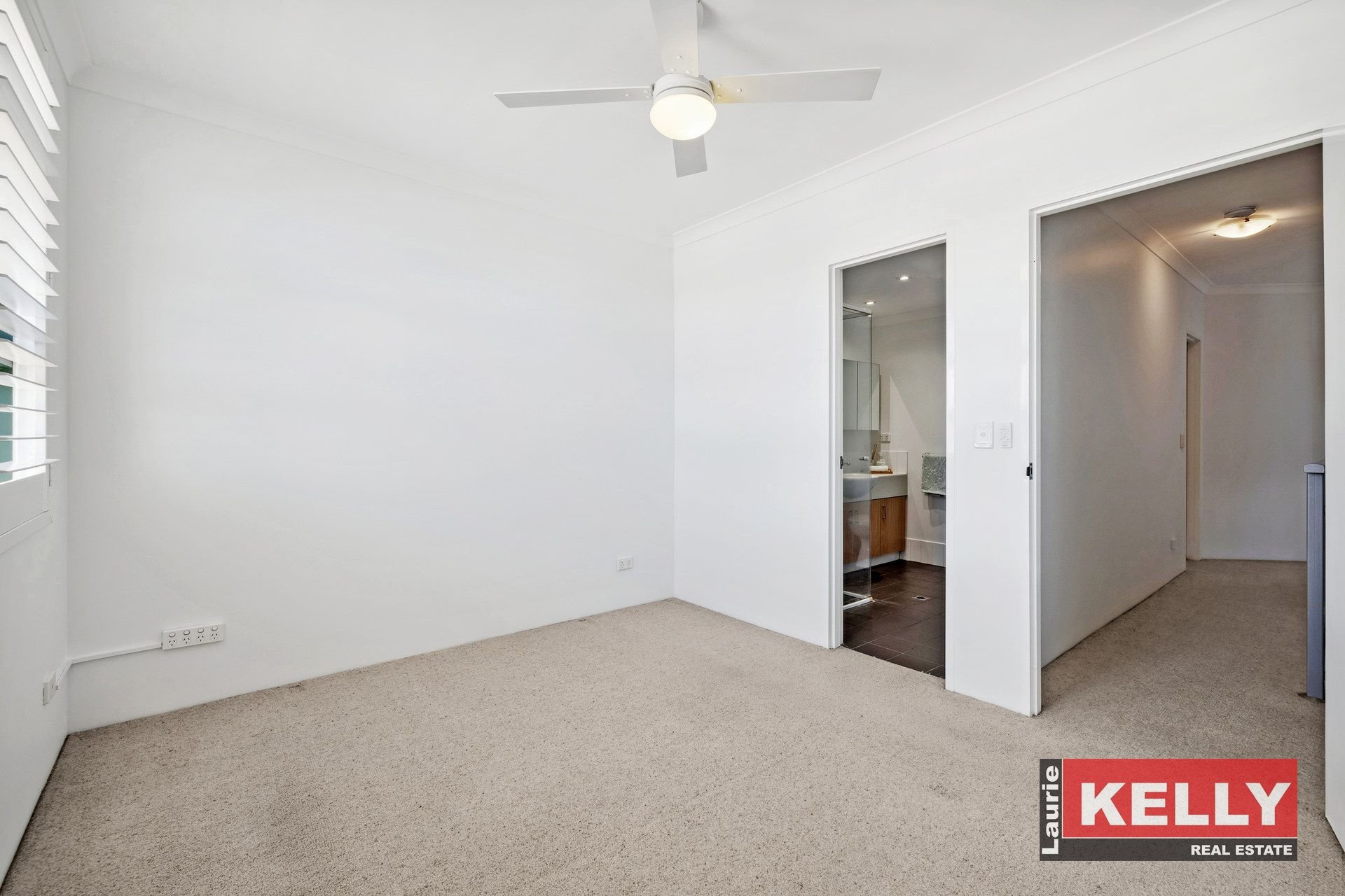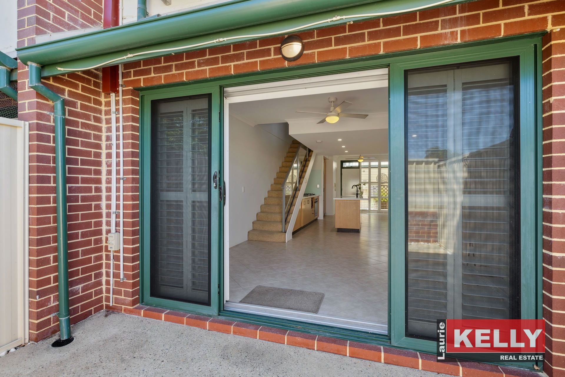 • Spacious tiled open plan living with plantation shutters.