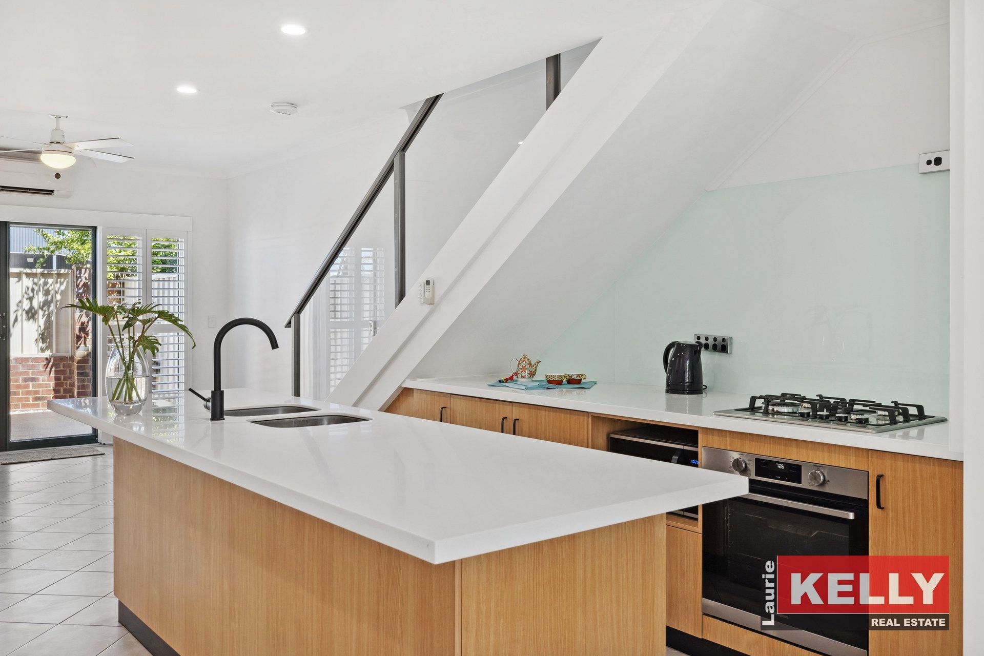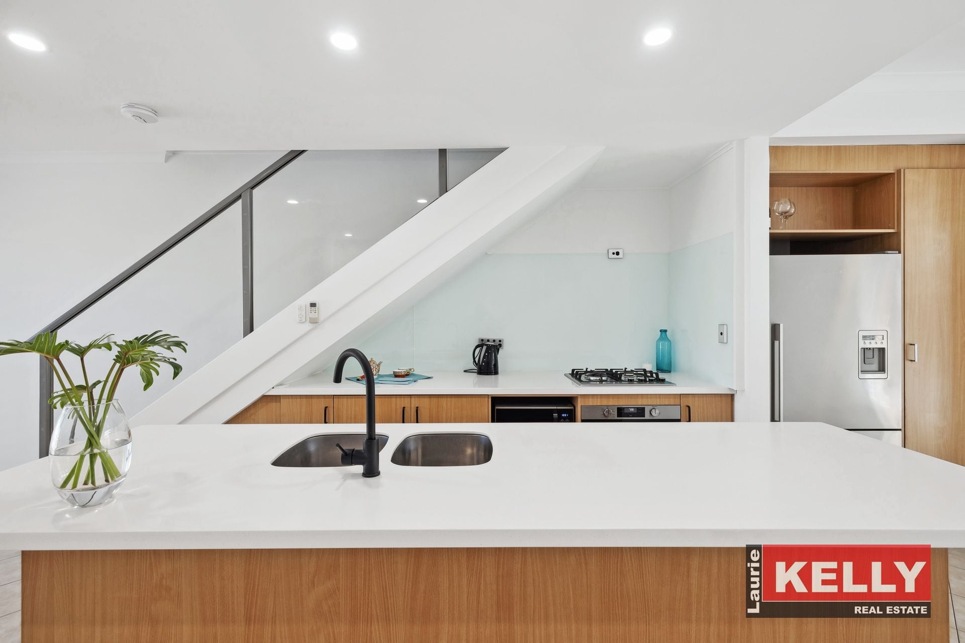 • Glass balustrade staircase leads to the first-floor level.