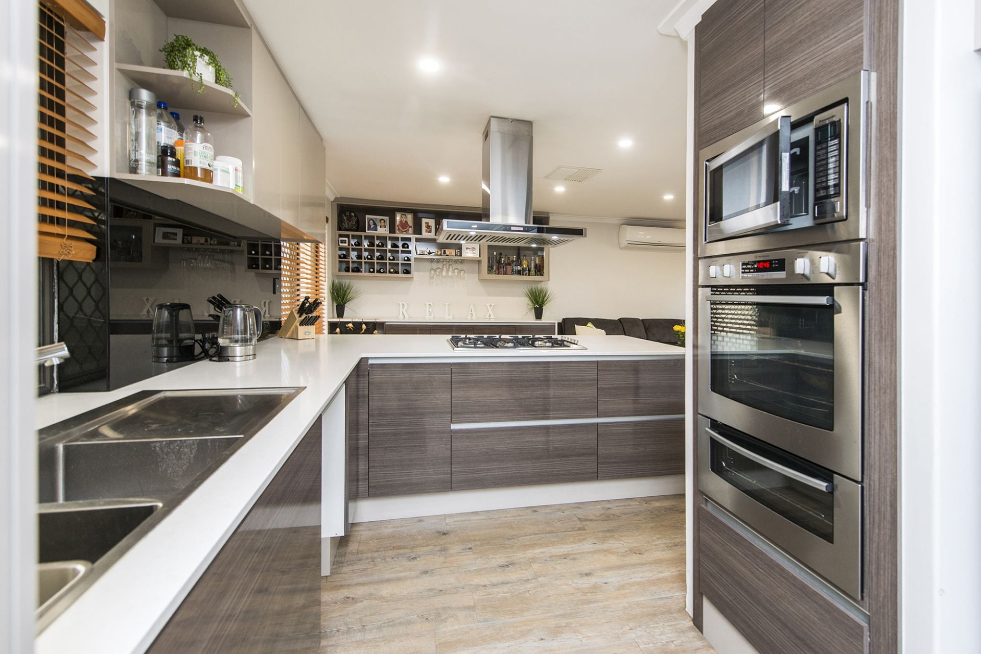 • Showcase kitchen w- stone top waterfall bench.
