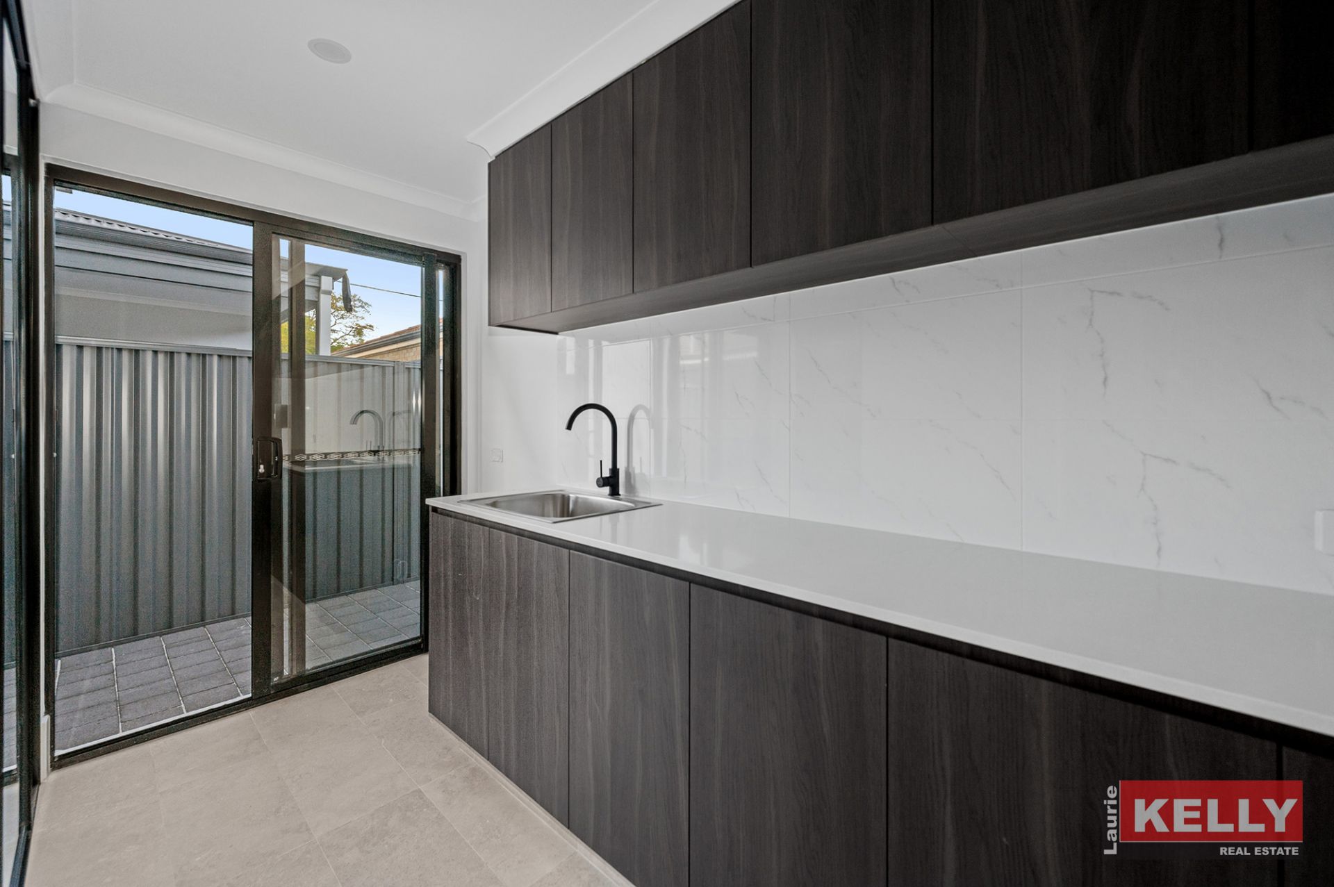 · High-end interiors with stone benchtops, full-height tiling and black tapware