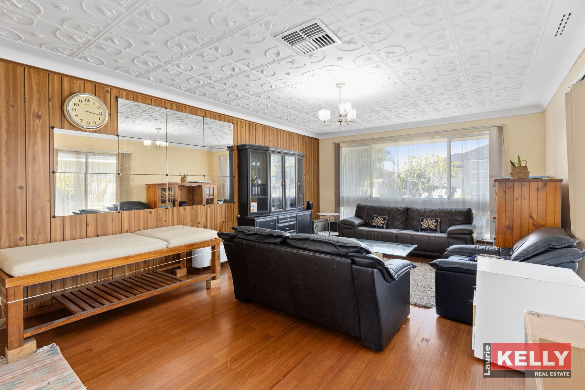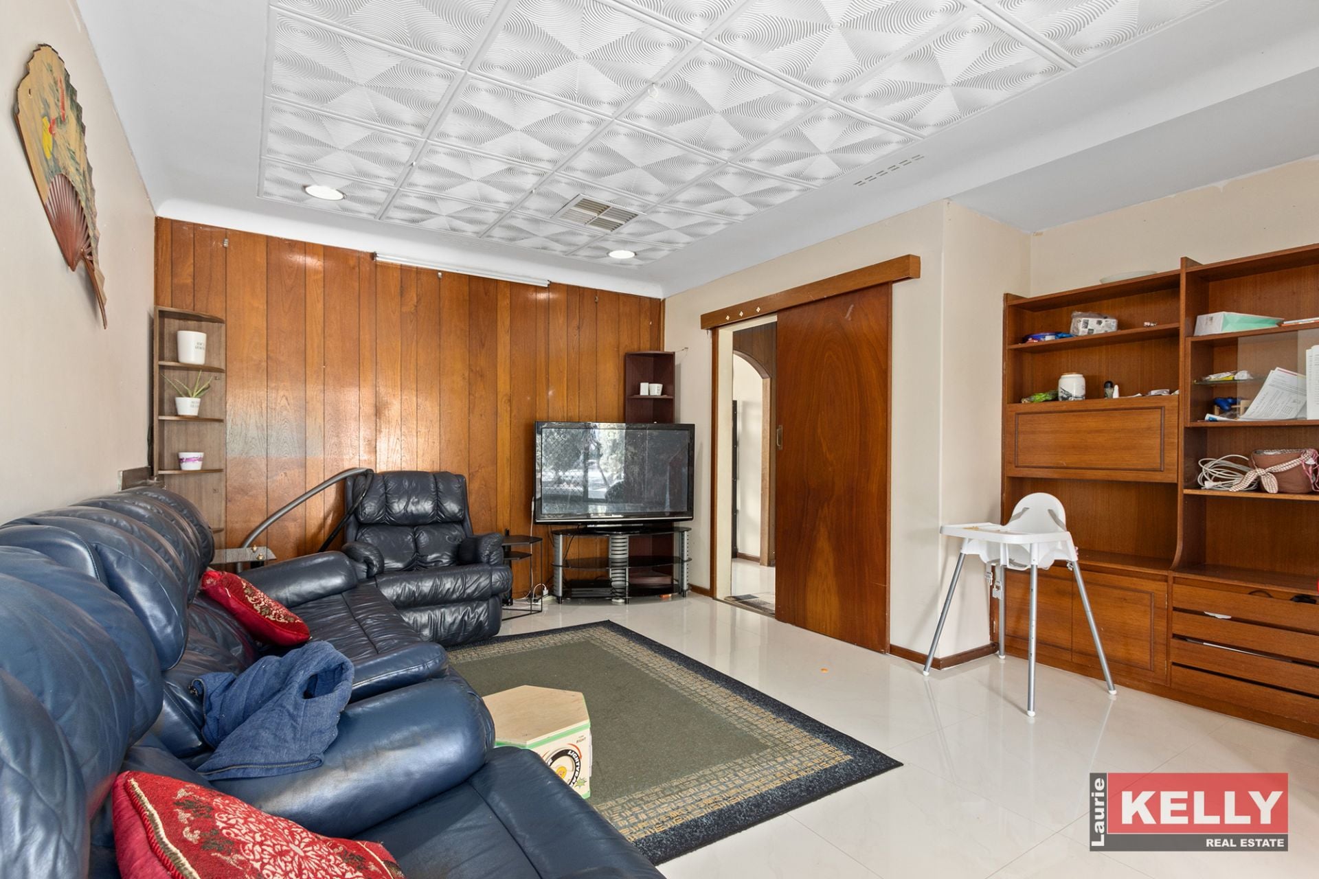 • Generous tiled family room with feature timber walls.