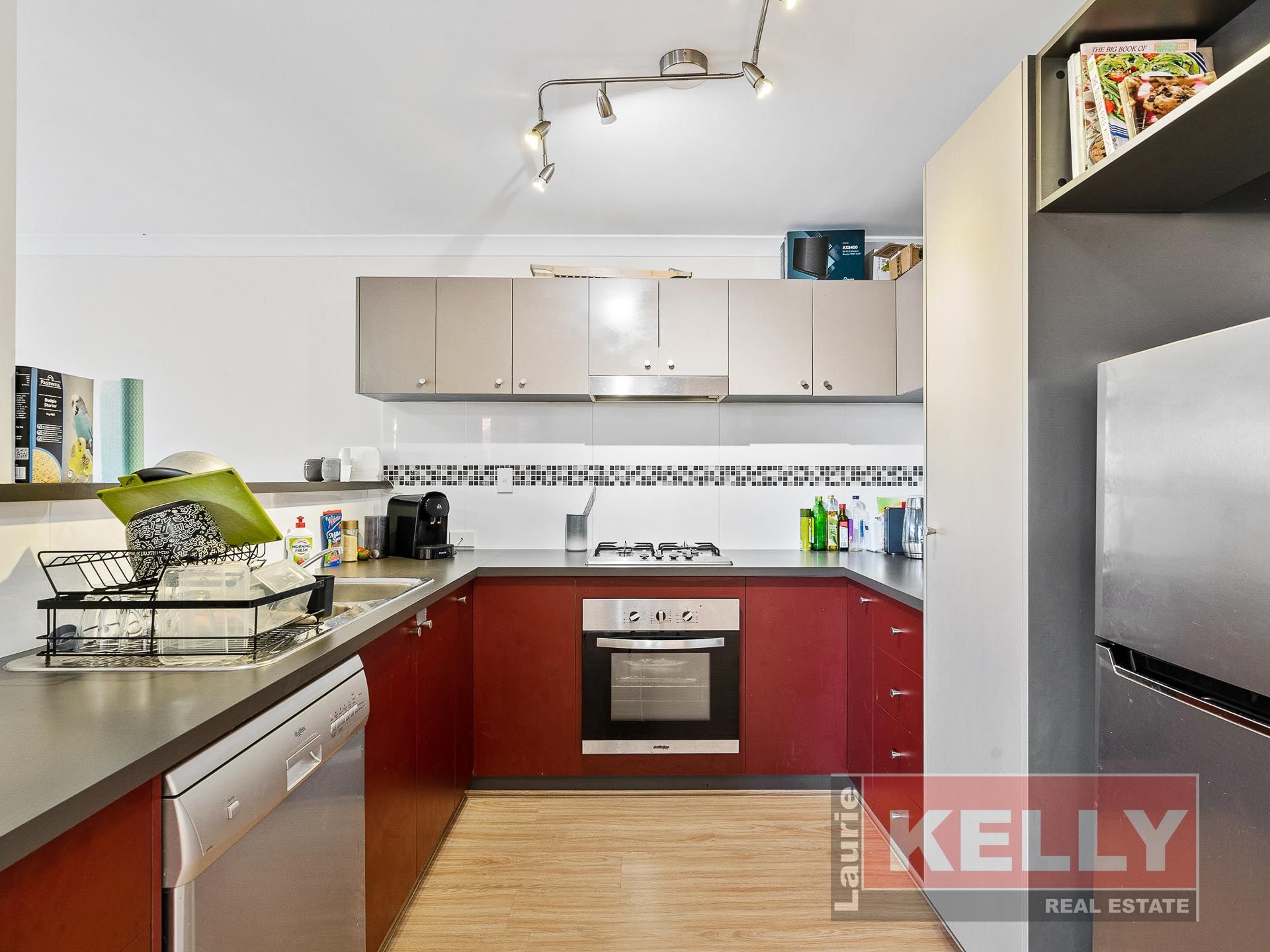 • Stylish kitchen with an abundance of bench space boasting overhead cupboards, stainless steel appliances including dishwasher, fan forced oven, 4 burner gas hotplate, integrated rangehood and double sink with flick mixer/water filter.